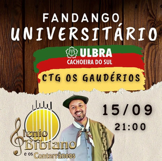 No dia 15 de setembro, o encerramento do domingo na Ulbra vai ser especial, quando no CTG Os Gaudérios ocorrerá o Fandango Universitário ao som de Clenio Bibiano.