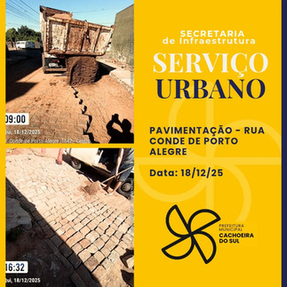 No Centro da cidade, equipes atuaram na Rua Conde de Porto Alegre, onde foi executado serviço de pavimentação, com recomposição do calçamento e melhorias na base da via. A intervenção busca garantir mais segurança e melhores condições de tráfego para motoristas e pedestres.