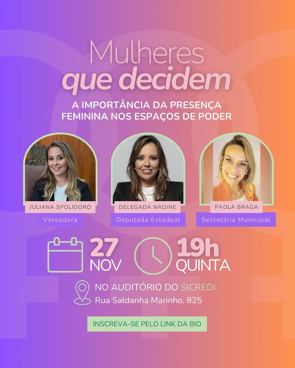 A proposta é incentivar mais mulheres a assumirem seu protagonismo, reconhecerem seu valor e se enxergarem nesses espaços. O encontro é gratuito, e as inscrições podem ser feitas pelo link disponível na bio das organizadoras.