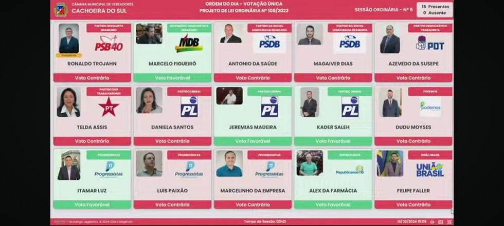 Os vereadores que votaram a favor do parcelamento foram: Marcelo Figueiró, Itamar Luz, Kader Saleh, Jeremias Madeira e Alex da Farmácia.