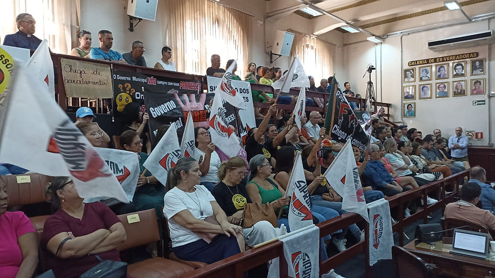 Foi reprovado na sessão ordinária da Câmara de Vereadores desta segunda-feira, 18 de março, por 10 votos contrários e 5 favoráveis, o Projeto de Lei nº 108 de 2023, que autorizaria o parcelamento de débitos do Executivo Municipal com o Fundo de Aposentadoria e Pensão dos Servidores (Faps) no período de março a setembro de 2023, em meio à intensa mobilização de servidores e secretariado, municipais, além da presença da presidência e de representantes do Sindicato dos Professores Municipais (Siprom) na tarde de hoje no plenário Edgar Müller.