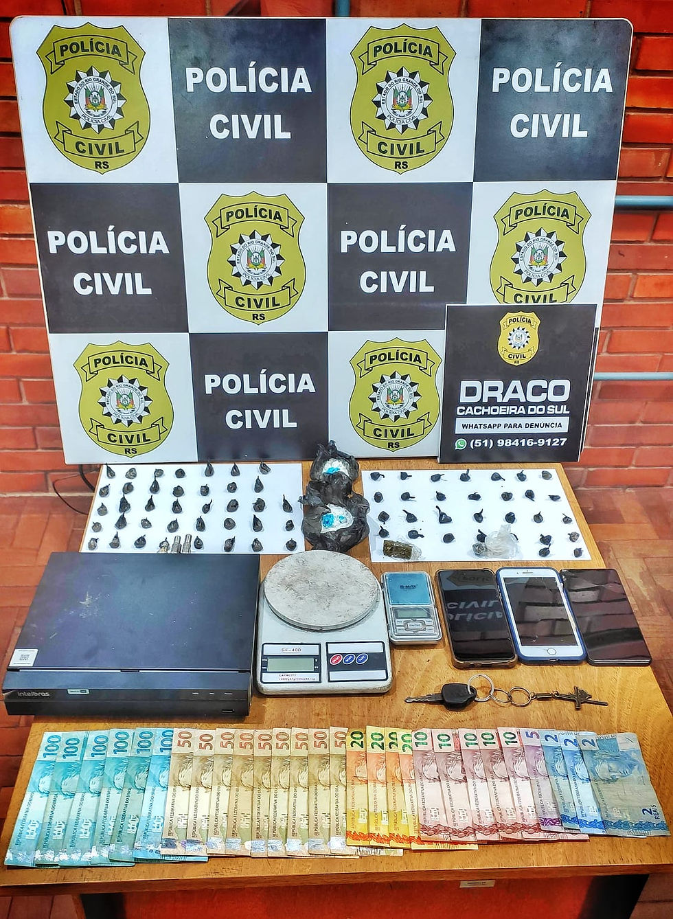No local, foram apreendidas 2 porções de maconha (7,5g), 30 porções de cocaína (18,6g), 2 invólucros de cocaína (100g), balanças de precisão, R$1.191,00, 3 aparelhos celulares, um aparelho DVR e um automóvel.