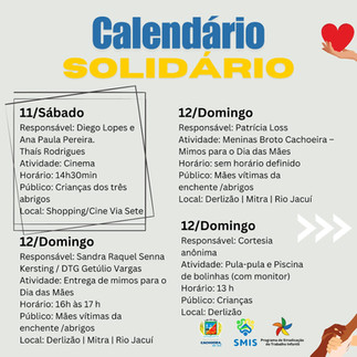 A Secretaria de Inclusão Social, por meio do Programa de Erradicação do Trabalho Infantil (PETI), idealizou o "Calendário Solidário", uma iniciativa repleta de atividades destinadas às pessoas afetadas pela recente enchente. As ações terão início neste sábado, dia 11, com uma sessão de cinema no Cine Via Sete para todas as crianças dos abrigos.