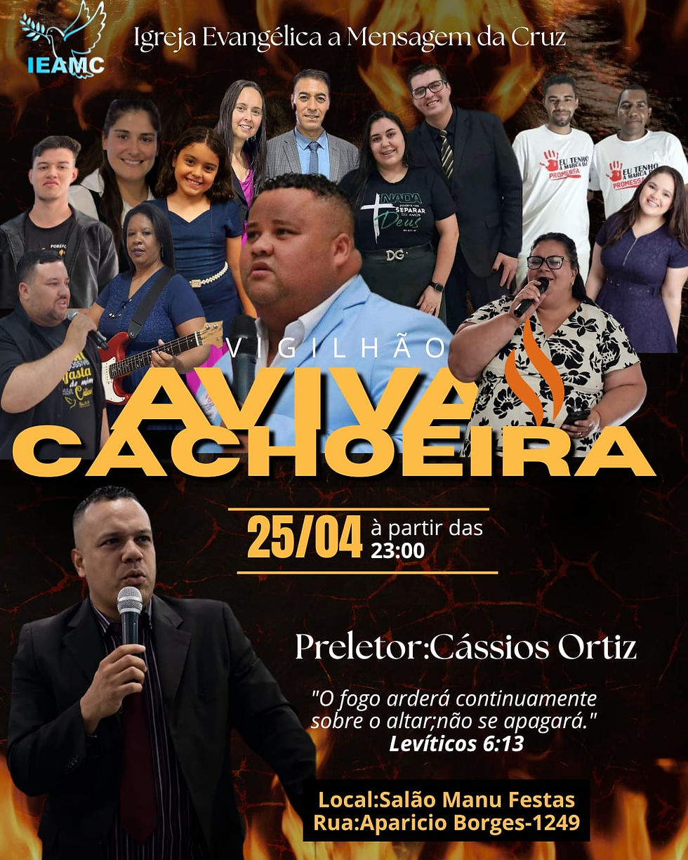 Cachoeira do Sul será palco, no próximo dia 25 de abril, do vigilhão “Aviva Cachoeira”, promovido pela Igreja Evangélica a Mensagem da Cruz. O evento inicia às 23h e será realizado no Salão Manu Festas, localizado na Rua Aparício Borges, 1249.